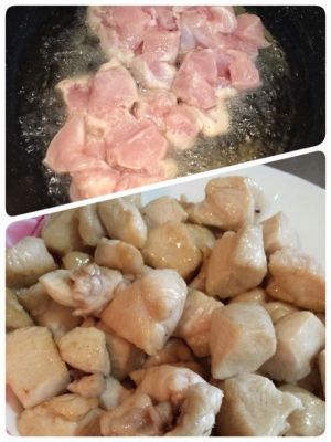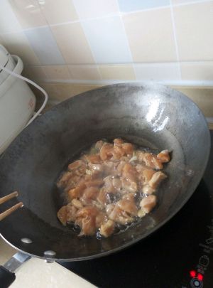 炒锅放油,稍多些,加点至6,7成热放入鸡丁煎炸(或是油温4成热滑炒鸡丁变色盛出)