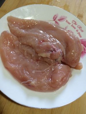 新鲜的鸡胸肉两块,大概一斤左右,正好一盘的量~