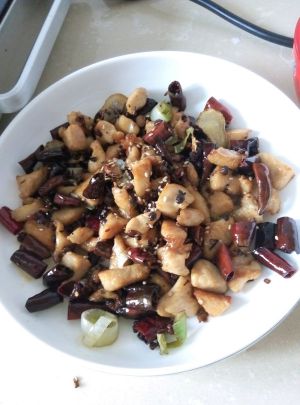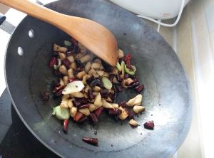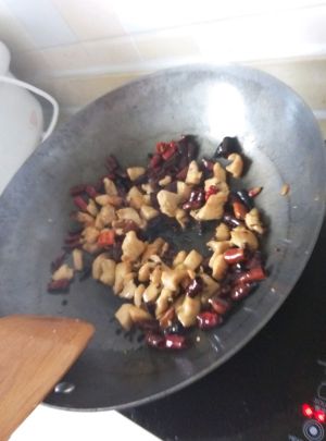 下入鸡丁,一起煸炒,加辣椒面,少许盐和生抽一起翻炒,别忘了放一粒冰糖,这是精髓。