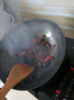 留少许底油,放入姜,蒜,干花椒爆香,放入一半青椒和1/3的红椒圈炒出辣味
