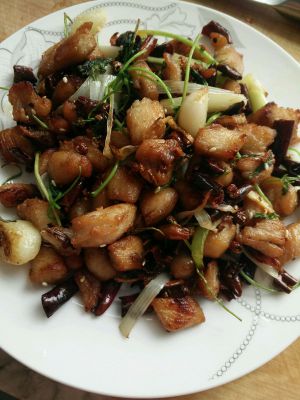 锅内放油,大火烧热后下鸡块,炸至外皮变干成金黄色后捞出备用(家里火力不够大的话可能需要复炸) 锅内留适量的油,下姜片、蒜片,炒出香味后放入花椒和干红椒,炒至稍有些呛鼻时,放入做未能(三)的鸡块,翻匀 最后放入鸡精、糖和葱段,即可起锅