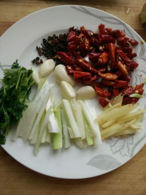 准备配料,干辣椒切小段,姜葱香菜切丝,蒜半4个左右