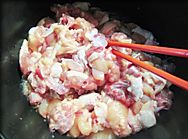 ▲放入1小勺盐,1小勺白胡椒粉,1小勺高度白酒,3大勺淀粉,用手抓匀。腌肉时盐要多放点,因为一会儿鸡块被炸过后,味道就很难再进去了。
