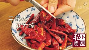 干辣椒用厨房纸擦干净表面的灰尘,剪成段抖掉辣椒籽和花椒装一起