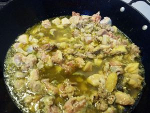 菜籽油烧热,将生姜放入,再放入鸡肉,要沥干水分!