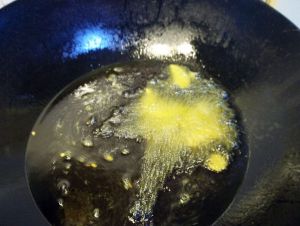 锅内放油,将腌制好的鸡块炸至金黄色,盛出备用。