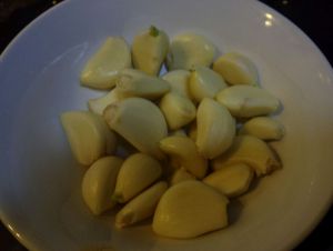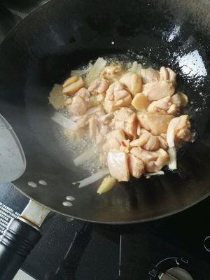 炒锅中放油,油烧热后下鸡肉煸炒1分钟,下姜片,再煸炒1分钟放蒜片。