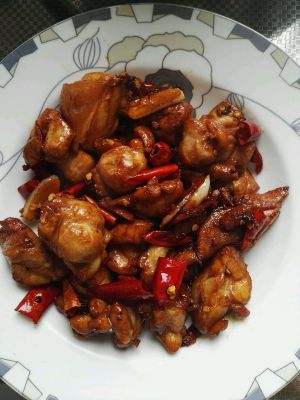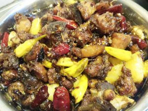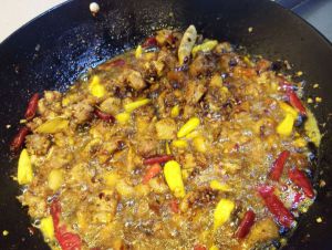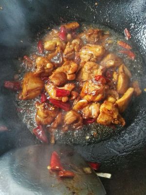 锅里烧油至7层热, 倒入姜蒜炒出香味后倒入干辣椒和花椒, 翻炒至气味开始呛鼻, 油变黄后倒入炸好的鸡块