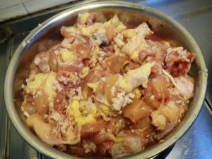 将土鸡切成小块,用料酒,盐,白糖适量腌啧1小时。