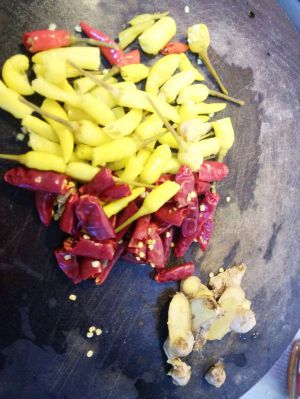 准备配料,根据自己的口味,生姜,干辣椒,泡椒,大蒜适量
