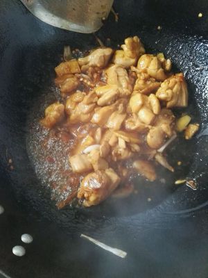 放入油,加入糖,把鸡肉挂糖色,加入土豆,加少许水,大蒜整块,锅中炖一会儿!