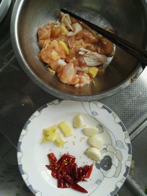 鸡块中加入1勺料酒,1勺酱油,1小勺盐,少许白糖,姜切片,葱切段,拌匀腌制20分钟左右入味。同时准备配料:干辣椒切段,蒜切片。
