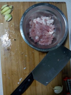 猪肉切丝,可略粗。以料酒,盐,生粉拌匀腌制入味。
