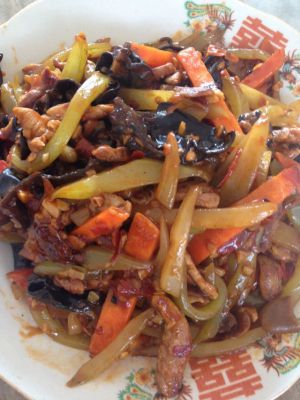 把胡萝卜丝青椒丝木耳丝倒入锅中翻炒,大直胡萝卜炒软放入一钥豆瓣酱,白糖和醋适量,继续翻炒,再放入肉丝翻炒一分钟,放些味精鸡精调味,即可出锅!