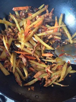 锅里放油烧直五成熟的时候下肉丝翻炒,再倒入一些老抽上色,把肉丝炒熟盛出备用!