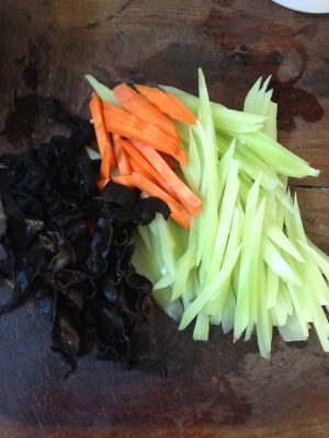 把胡萝卜和青椒还有木耳切成细丝,留着备用!