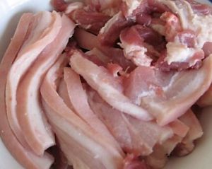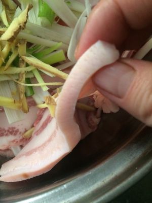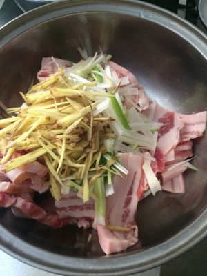 五花肉 最好带皮,那样子吃起来会比较糯,比较Q,肉洗干净,在滚水里面抄一下,拿出来,立马用凉水冲,然后切成一个指节的厚度,待用。