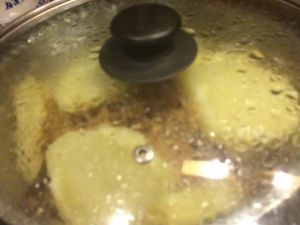 我用了土豆厚片, 一片片盖满铁盆, 大火上笼蒸50-60分钟。