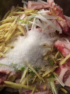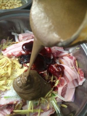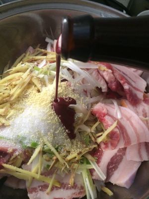 五花肉切成0.5厘米厚的片,要肥瘦相间的才香,倒两盖加饭酒,姜丝,五勺老抽,两勺南乳汁(可以把豆腐乳用老抽化开当南乳汁),一勺临江寺豆瓣,搅拌均匀腌制十分钟
