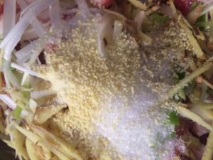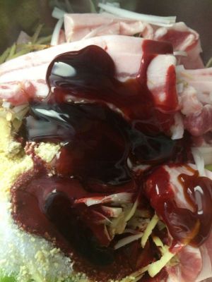 重点在这里。把五花肉放在另外一个空盘子里,放上酱油或者生抽拌匀,放点鸡精,一点盐,拌匀,你要在超市买标注了 专业粉蒸肉的粉子。。不要买错了。那种专业的糯米粉是有调味过的,所以,五花肉里面不要在放很多盐。把姜丝一起拌匀。如果不是很黏合,那就加一点水。要干干的。黏黏的。不要放多了水。好了。就这么搞定了。