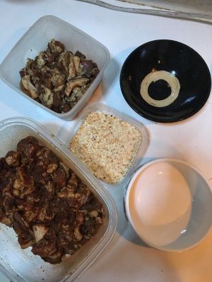 我习惯用一次性手套把肉在米上来回揉搓,那样米就均匀黏在肉的表面了。