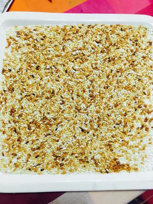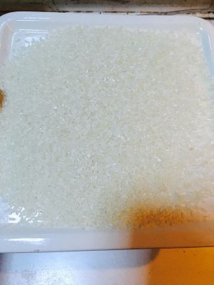 准备白米一碗平铺在微波炉专用烤盘上