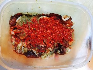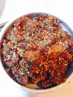 麻辣的就是在五香的基础上又加了辣椒面和花椒粉,具体量根据个人喜好加,接下来把肉就可以放冰箱了,想好吃这肉至少腌制三小时以上才好