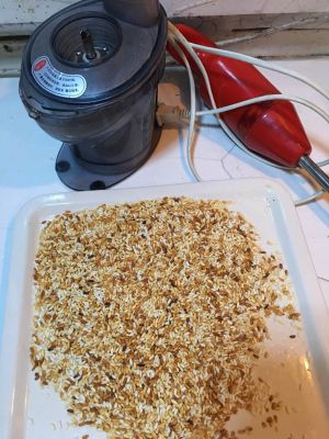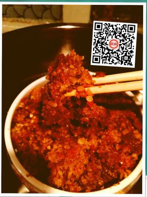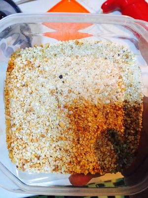 大米入锅翻炒,放入花椒,炒至黄白,有香味,如粉碎机粉碎,大概成鱼籽大小