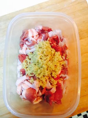 生姜切沫和肉片搅匀