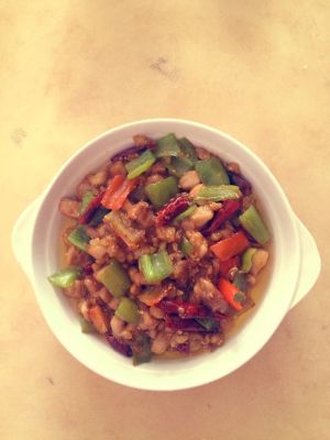 另起锅 倒入少许油 葱姜蒜爆锅 放入干辣椒炒至微微变色 然后放入青红椒翻炒 然后倒入鸡丁翻炒 倒入调好的碗汁 出锅前撒上点芝麻即可
