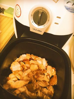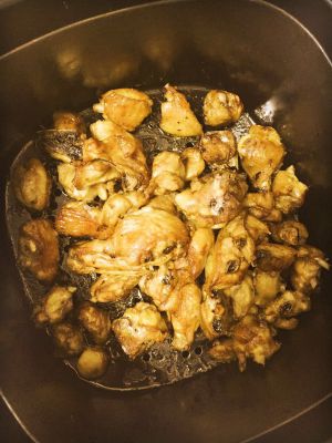 腌好的鸡肉放进空气炸锅,200度15分钟,翻一翻,再来15分钟,根据不同情况可以多炸一下