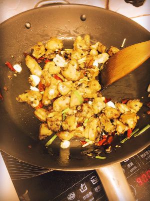 锅中倒油加热,放入切好的花椒、葱、姜、干辣椒爆香,倒入切好的鸡肉,翻炒至鸡肉八层熟,倒入酱油上色,继续翻炒