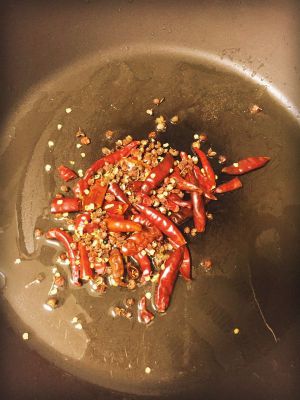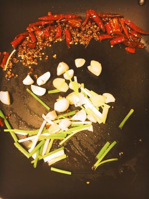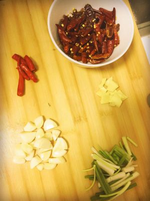 这个时候准备炒料,把葱姜蒜切好,干辣椒剪开与花椒放在一起。