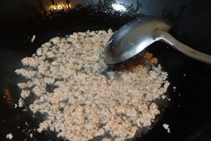 另起油锅,放入熟猪油,猪肉末,将肉末炒至散开,炒干水汽、亮油。