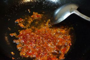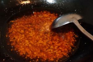 起锅放入少许油,豆瓣酱放入锅中煸炒,炒出红油放入肉沫一起煸炒