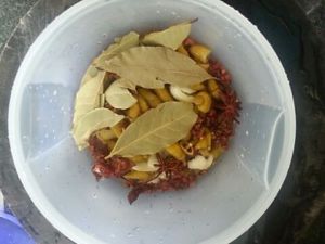 煮鸡脚同时准备配料,把姜切片,蒜拍好,八角,香叶,花椒放入一个大碗中,