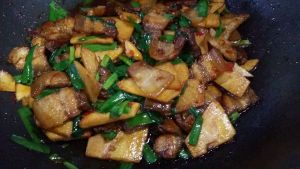 苕皮放凉切片,煮好的五花肉切薄片,蒜苗切段备用;
