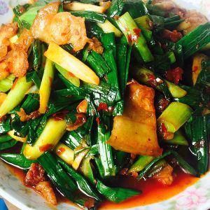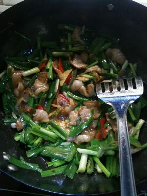 看油炸的差不多了,放姜和花椒,翻炒几下,放两勺豆瓣,接着炒!然后先放蒜头,炒两分钟的样子再放蒜苗,炒1分钟,放点淀粉鸡精和成的水,收汁起锅!