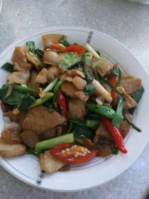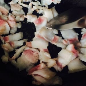 起锅烧油 油到7分热的时候下入切好的五花,翻炒的时候放一点料酒去腥,五花炒到微微发黄卷翘下入配菜