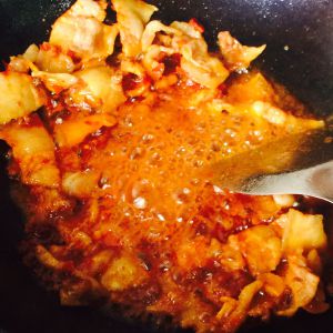 待肉片爆香出油,把肉推到四周或者锅边,加入剁细的郫县豆瓣,煸炒出香味,再加入白糖提鲜,倒入一小瓶盖白酒激发肉的香味,一起翻炒均匀