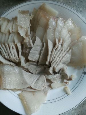 煮好五花后晾凉 再切片 切的越薄越好,如果是刀工考试 我一定是不及格的那个