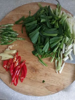 葱斜刀切块 姜切片 线椒青椒切滚刀 大蒜切碎备用