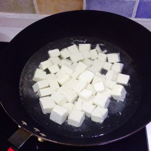 豆腐切块冷水锅焯水至一定程度老出,备用。