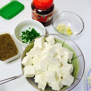 准备所有材料,豆腐切块,葱切颗粒,姜蒜切成颗粒。