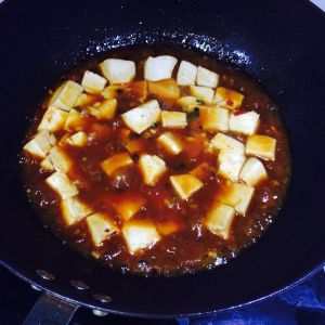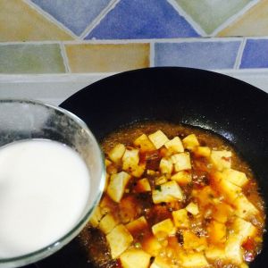 加两勺水,下豆腐丶下老抽丶盐(少量)丶糖 大火煮至2-3分钟,下湿淀粉,晃锅,最后加上花椒油,辣油,煮至2-3分钟,出锅子