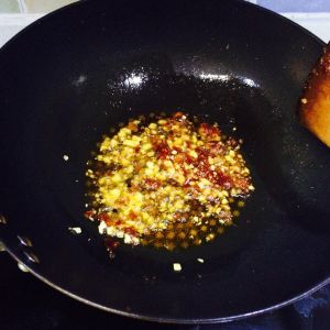 锅内放油,炒香姜粒蒜粒豆瓣酱。