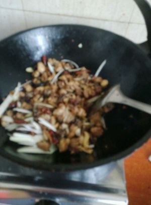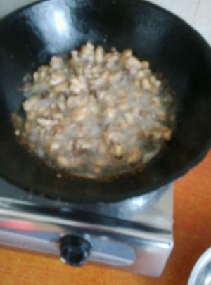 再倒入鸡肉,放盐,少许鸡精(可不放),炒匀,就可以出锅了。
