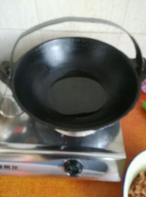 把肉扒拉一边锅倾斜滤出油下入辣椒翻炒。