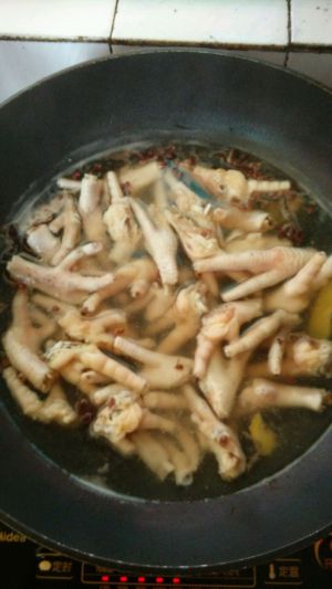 2、水烧开,放入鸡爪,花椒,八角,姜,煮5-10分钟