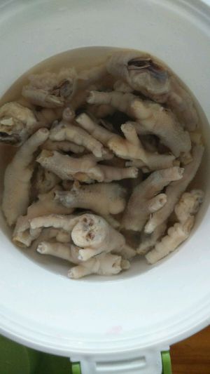 将鸡脚洗净,将指甲去掉放入锅中,加水,盐,鸡精,味精,香菜,小葱,花椒籽,料酒煮10分钟左右,熟透即可,捞出后冲凉(尽量将油冲掉),完全冷后捞出沥水。净郭烧开水凉凉备用。